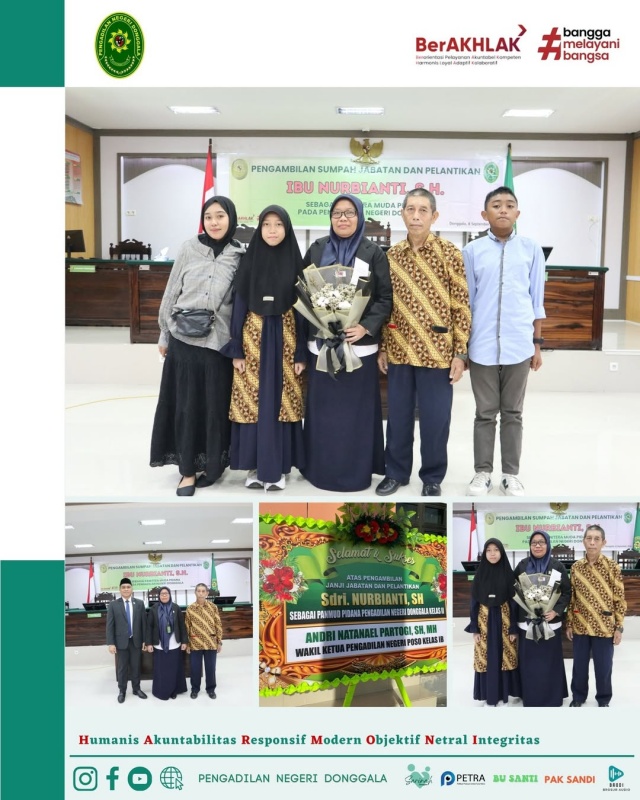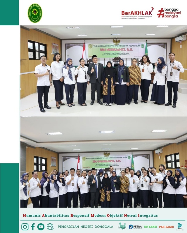 Donggala- Senin, tanggal 8 September 2025, Ketua Pengadilan Negeri Donggala, YM Bapak Niko Hendra Saragih, S.H.,M.H mengambil sumpah dan melantik pejabat kepaniteraan yakni Ibu Nurbianti, S.H menjadi Panitera Muda Pidana. Acara ini dilaksanakan di ruang sidang utama Prof. Dr.H.M Syarifuddin, S.H.,M.H, dihadiri oleh Bapak dan Ibu Hakim, Pejabat Struktural dan Fungsional,Staf, CPNS dan PPPK Pengadilan Negeri Donggala.