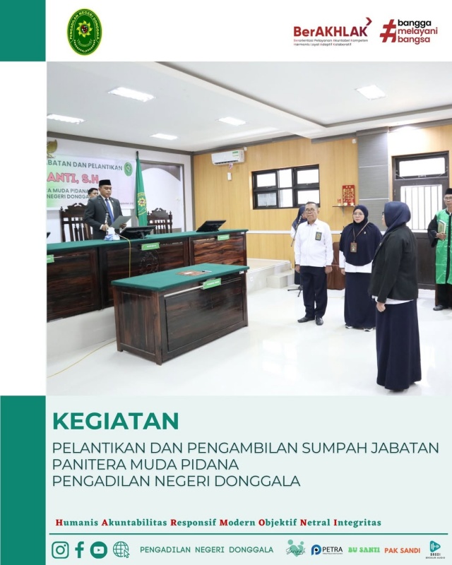 Acara Pelantikan diawali dengan Pembacaan Surat Keputusan Direktorat Badan Peradilan Umum (Badilum) Mahkamah Agung Republik Indonesia dan dilanjutkan dengan pengambilan sumpah jabatan dan kata-kata pelantikan oleh Ketua Pengadilan Negeri Donggala. Acara kemudian dilanjutkan dengan penandatanganan berita acara pelantikan. Acara Berlangsung dengan khidmat dan lancar.