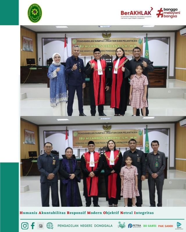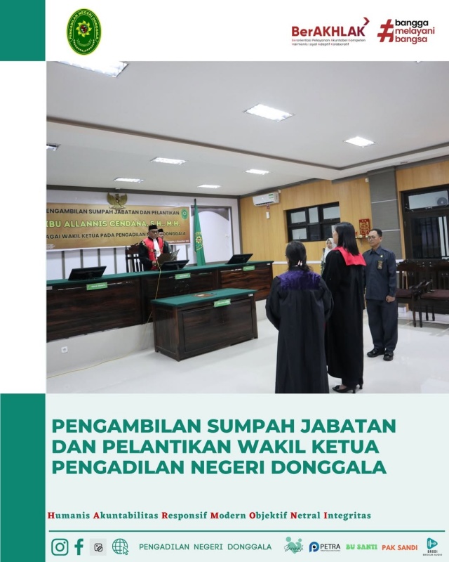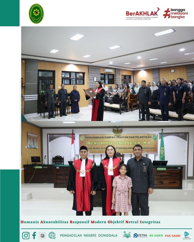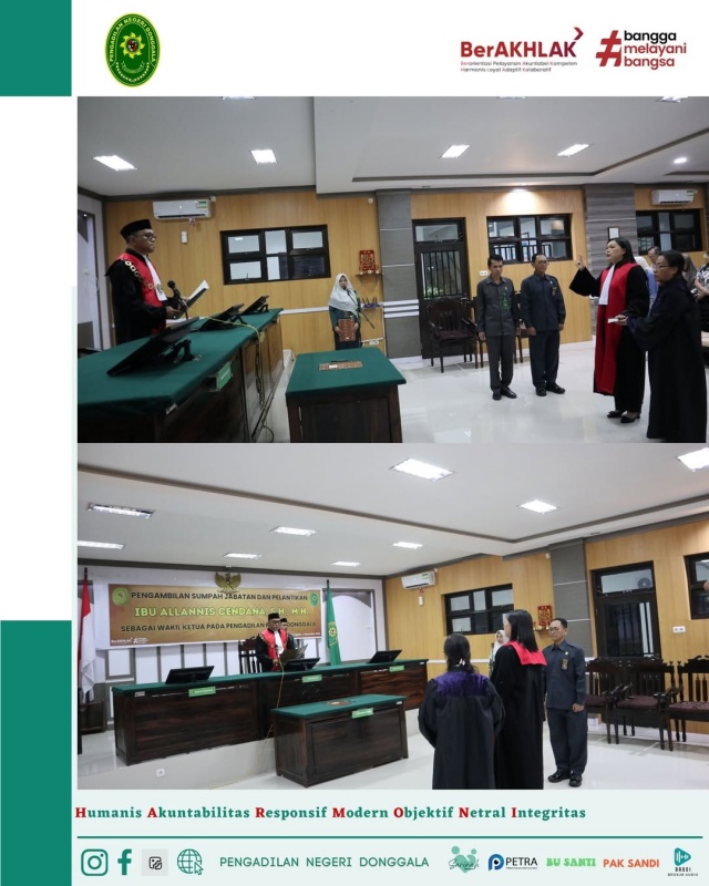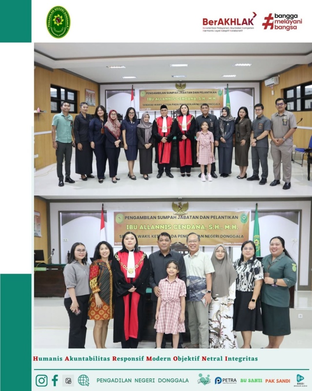 Selasa, 04 November 2025 . Ketua Pengadilan Negeri Donggala, Bpk. Niko Hendra Saragih, S.H.,M.H. melantik Ibu Allanis Cendana, S.H., M.H. sebagai Wakil Ketua Pengadilan Negeri Donggala. Ibu Allanis Cendana, S.H., M.H. sebelumnya menjabat sebagai Wakil Ketua Pengadilan Negeri Parigi, dan beliau juga pernah menjabat sebagai Hakim di Pengadilan Negeri Donggala pada tahun 2018 s.d 2021. Dengan dilantiknya Ibu Allanis Cendana, S.H.,M.H sebagai Wakil Ketua, kini posisi Wakil ketua di Pengadilan Negeri Donggala yang kosong selama hampir 2 (dua) tahun terakhir kini terisi.