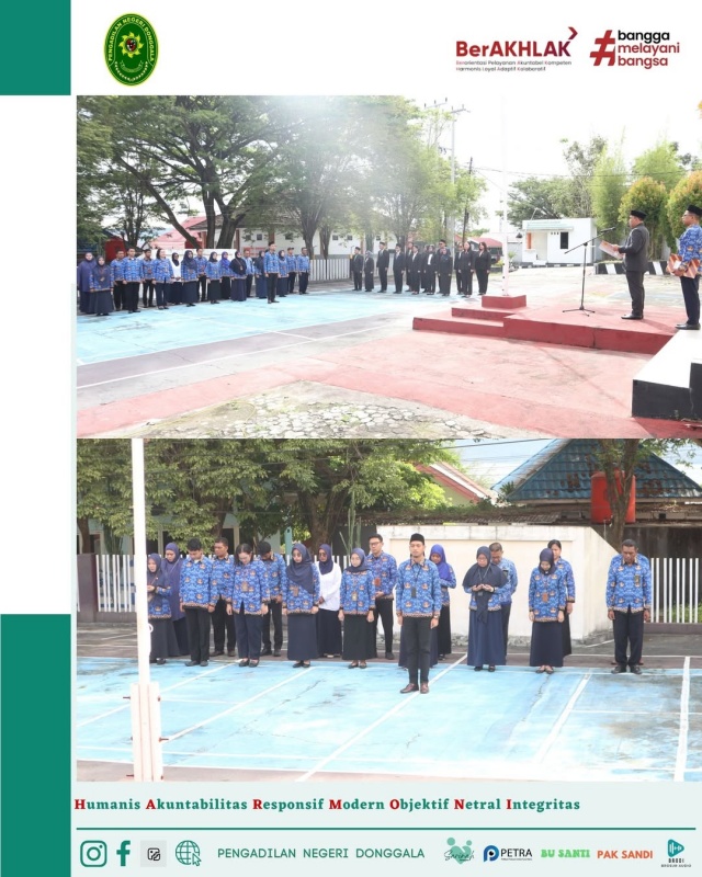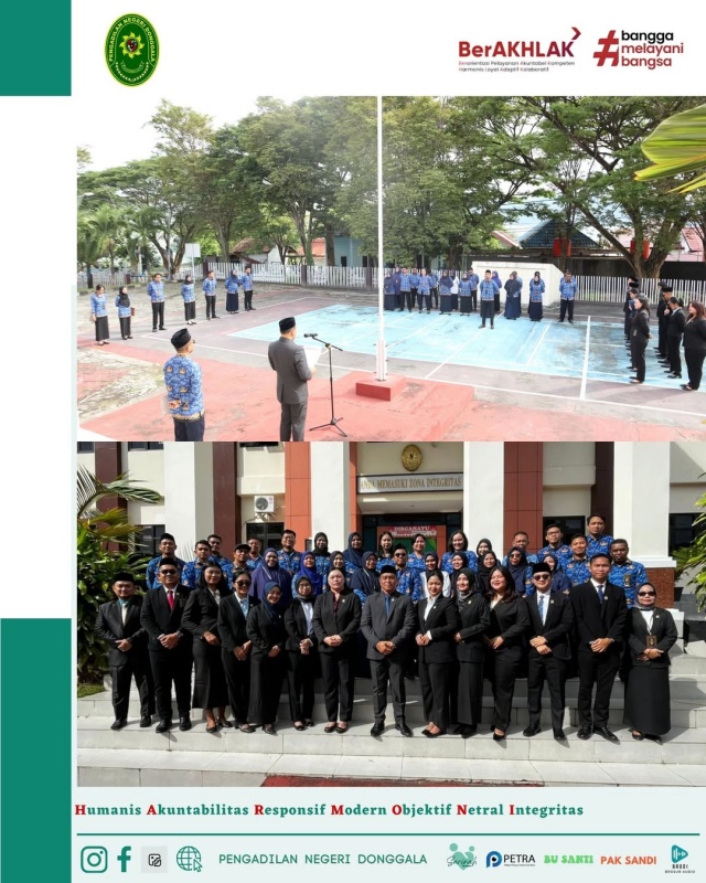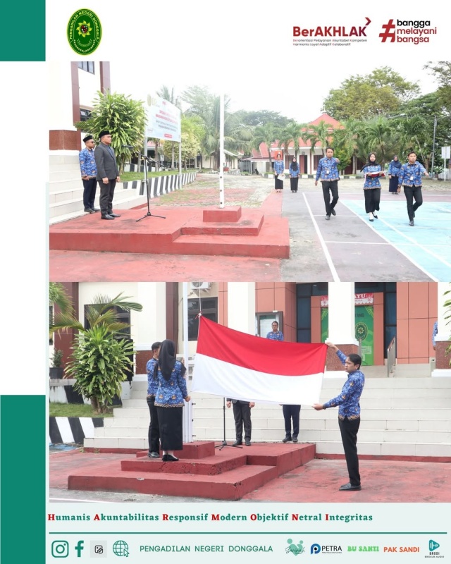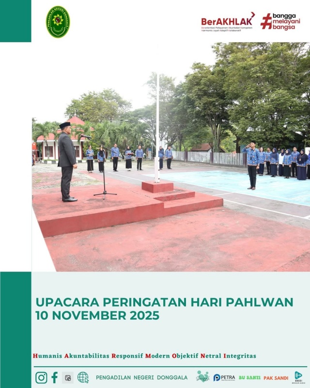 Dalam rangka memperingati Hari Pahlawan, Pengadilan Negeri Donggala menggelar upacara pada Senin pagi 10 November 2025 yang berlangsung khidmat di halaman kantor Pengadilan Negeri Donggala. Peringatan Hari Pahlawan tahun 2025 mengusung tema ”Pahlawanku Teladanku, Terus Bergerak Melanjutkan Perjuangan”. Upacara tersebut dihadiri oleh seluruh pimpinan, wakil ketua, hakim, pejabat struktural dan fungsional, staf dan PPPK Pengadilan Negeri Donggala. Bertindak sebagai pembina upacara, Bapak Niko Hendra Saragih, SH., MH, Ketua Pengadilan Negeri Donggala, menyampaikan pesan kepahlawanan dalam amanatnya. Beliau mengingatkan pentingnya meneladani semangat juang para pahlawan dan menerapkannya dalam kehidupan sehari-hari, khususnya dalam pelayanan kepada masyarakat di lingkungan pengadilan. “Sebagai abdi negara, kita dituntut untuk berpegang pada kejujuran, kedisiplinan, dan kerja keras dalam menjalankan tugas, sebagaimana yang diwariskan oleh para pahlawan kita,” ujar Bapak Niko Hendra Saragih, SH., MH dalam sambutannya.Dengan khidmatnya peringatan Hari Pahlawan tahun ini, seluruh pegawai diharapkan mampu menjadikan nilai-nilai kepahlawanan sebagai teladan dalam melaksanakan tugas dan pelayanan bagi masyarakat Kabupaten Donggala.