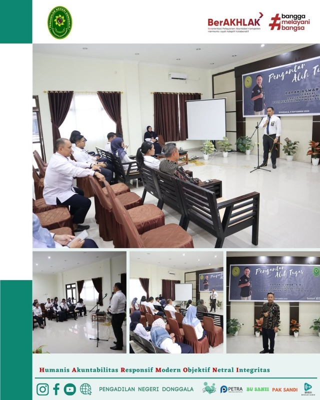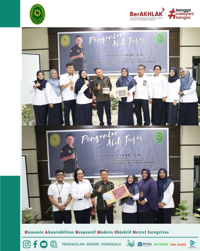 Donggala - Pengadilan Negeri Donggala menyelenggarakan Acara Pengantar Alih Tugas Panitera sebagai bentuk apresiasi dan penghormatan atas dedikasi dan pengabdian Bapak Aswar, S.H., yang akan menjalankan tugas di tempat yang baru. Acara ini berlangsung pada hari Senin, 8 September 2025 dan dihadiri oleh Ketua, Bapak/Ibu Hakim, pejabat struktural dan fungsional, serta seluruh keluarga besar Pengadilan Negeri Donggala.
