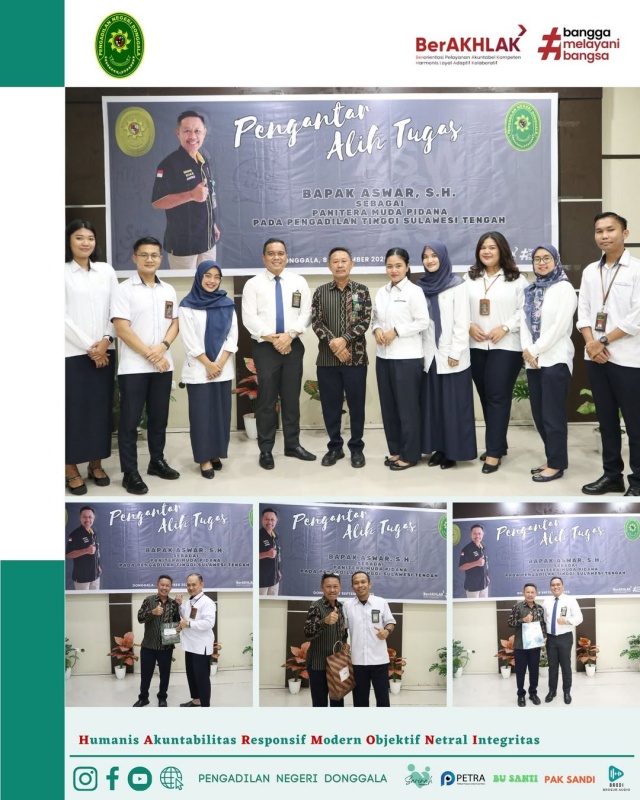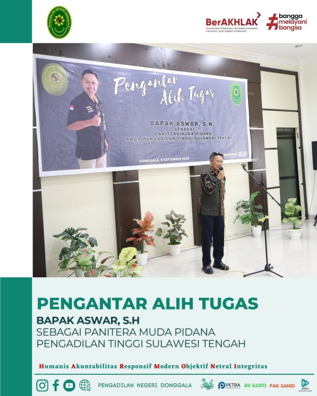 Dalam sambutannya, Ketua Pengadilan Negeri Donggala, YM Bapak Niko Hendra Saragih, S.H.,M.H menyampaikan rasa terima kasih atas kontribusi besar yang telah diberikan oleh Bapak Aswar, S.H selama bertugas. Loyalitas, integritas, dan profesionalisme beliau telah memberi warna tersendiri dalam perjalanan Pengadilan Negeri Donggala.