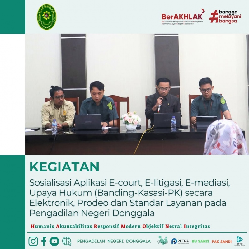 Sosialisasi Aplikasi E-Court, E-Litigasi, E-Mediasi, Upaya Hukum (Banding, Kasasi, PK) secara Elektronik, Prodeo, dan Standar Layanan pada Pengadilan Negeri Donggala pada tanggal 28 Mei 2025.