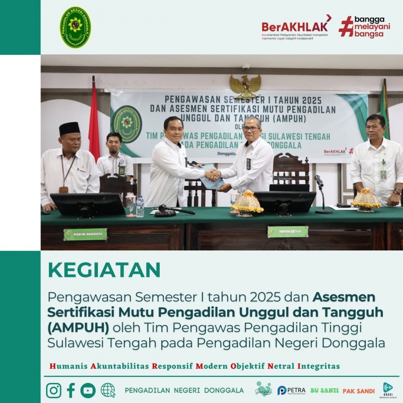 Pengasawan Semester I dan Asesmen Sertifikasi Mutu Pengadilan Unggul dan Tangguh (AMPUH) Tahun 2025 oleh Tim Pengawas Pengadilan Tinggi Sulawesi Tengah pada Pengadilan Negeri Donggala