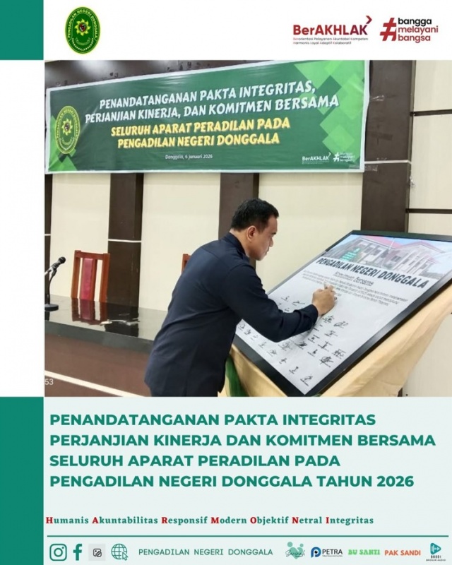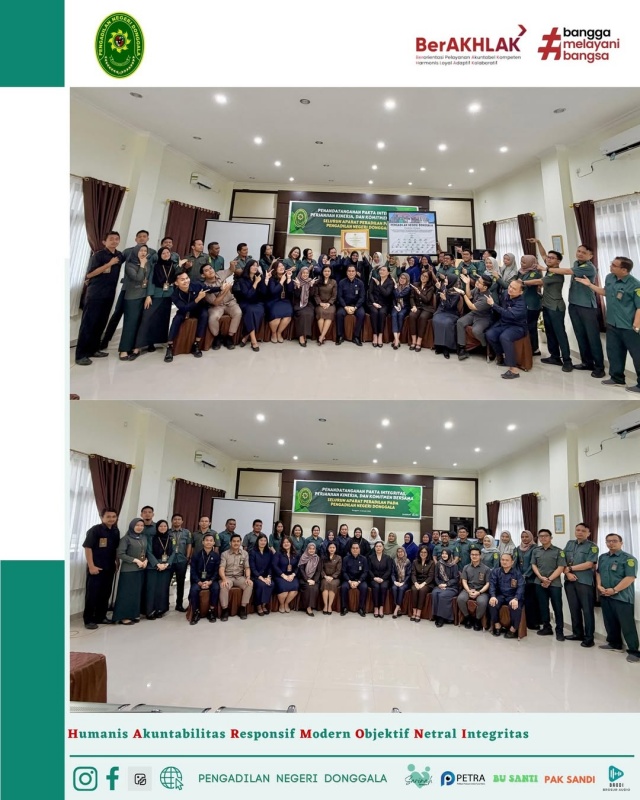 Donggala - Pengadilan Negeri Donggala melaksanakan kegiatan Penandatanganan Pakta Integritas dan Komitmen Bersama yang bertempat di Ruang Aula lantai II Pengadilan Negeri Donggala, pada Selasa, 6 Januari 2026. Kegiatan ini diikuti oleh Ketua Pengadilan Negeri Donggala, Wakil Ketua, para Hakim, Pejabat Struktural dan Fungsional, serta seluruh Aparatur Sipil Negara (ASN) Pengadilan Negeri Donggala. Penandatanganan Pakta Integritas dan Komitmen Bersama merupakan agenda rutin yang dilaksanakan sebagai bentuk komitmen bersama dalam mewujudkan penyelenggaraan peradilan yang bersih, berintegritas, profesional, transparan, dan akuntabel. Melalui penandatanganan ini, seluruh jajaran Pengadilan Negeri Donggala menyatakan kesanggupan untuk: Menjunjung tinggi nilai integritas dan etika dalam menjalankan tugas, Menolak segala bentuk praktik korupsi, kolusi, dan nepotisme (KKN), Memberikan pelayanan peradilan yang prima kepada masyarakat pencari keadilan, Melaksanakan tugas dan tanggung jawab sesuai dengan peraturan perundang-undangan yang berlaku. Ketua Pengadilan Negeri Donggala dalam sambutannya menegaskan bahwa Pakta Integritas dan Komitmen Bersama bukan hanya sekadar seremonial, melainkan harus diimplementasikan secara nyata dalam setiap pelaksanaan tugas dan fungsi, baik di bidang yudisial maupun non-yudisial. Seluruh aparatur diharapkan dapat menjaga kepercayaan publik terhadap lembaga peradilan dengan bekerja secara profesional dan penuh tanggung jawab. Kegiatan ini sekaligus menjadi momentum awal di tahun 2026 untuk memperkuat tekad dan sinergi seluruh aparatur Pengadilan Negeri Donggala dalam mendukung terwujudnya Zona Integritas menuju Wilayah Bebas dari Korupsi (WBK) dan Wilayah Birokrasi Bersih dan Melayani (WBBM). Dengan adanya penandatanganan Pakta Integritas dan Komitmen Bersama ini, Pengadilan Negeri Donggala berkomitmen untuk terus meningkatkan kualitas kinerja dan pelayanan demi tercapainya peradilan yang agung.