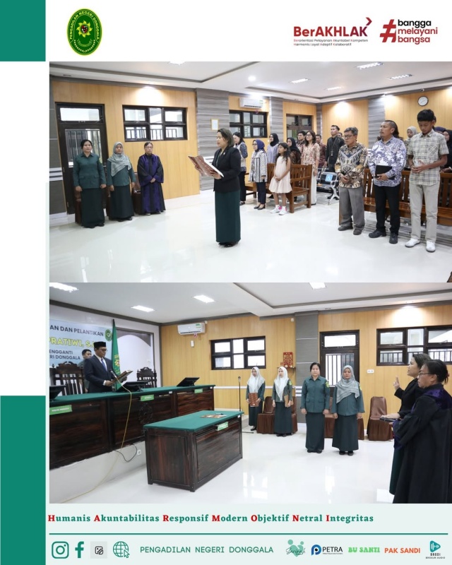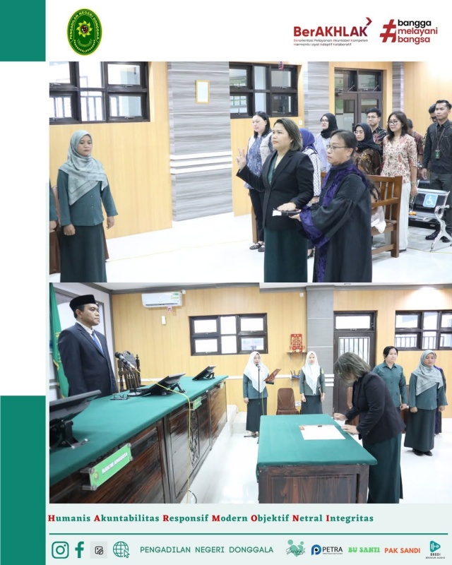Acara dipimpin langsung oleh Ketua Pengadilan Negeri Donggala, Bapak Niko Hendra Saragih, S.H., M.H. Dalam sambutannya, Ketua menyampaikan ucapan selamat serta harapan agar pejabat yang baru dilantik dapat menjalankan tugas dengan penuh integritas, profesionalitas, dan dedikasi tinggi dalam mendukung kelancaran proses peradilan. “Sumpah jabatan yang diucapkan hari ini bukan sekadar kata-kata, tetapi komitmen moral dan tanggung jawab kepada negara, bangsa, serta masyarakat pencari keadilan,” ujarnya.