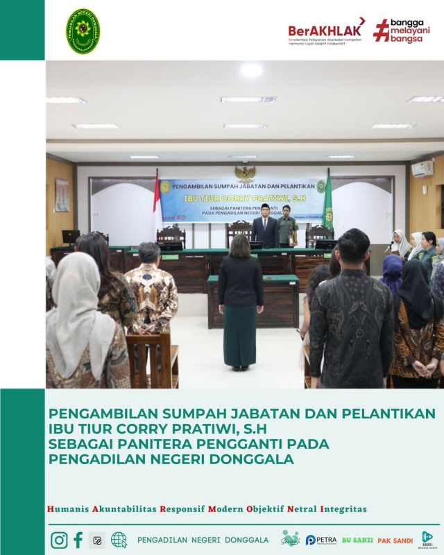 Donggala, 12 Desember 2025 – Pengadilan Negeri Donggala menggelar acara pelantikan dan pengambilan sumpah jabatan Panitera Pengganti secara khidmat pada Jumat, 12 Desember 2025 pukul 14.00 WITA. Bertempat di Ruang Sidang Utama Pengadilan Negeri Donggala, Ibu Tiur Corry Pratiwi, S.H. resmi dilantik dan mengucapkan sumpah jabatan sebagai Panitera Pengganti Pengadilan Negeri Donggala.
